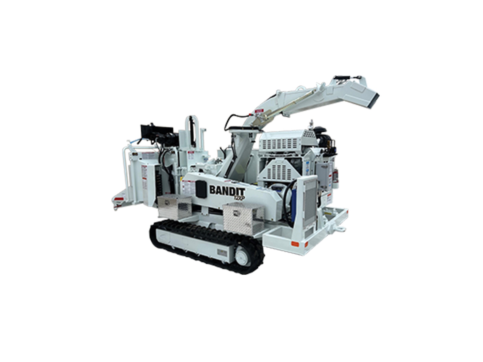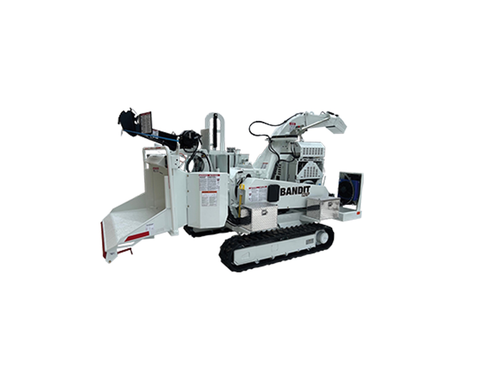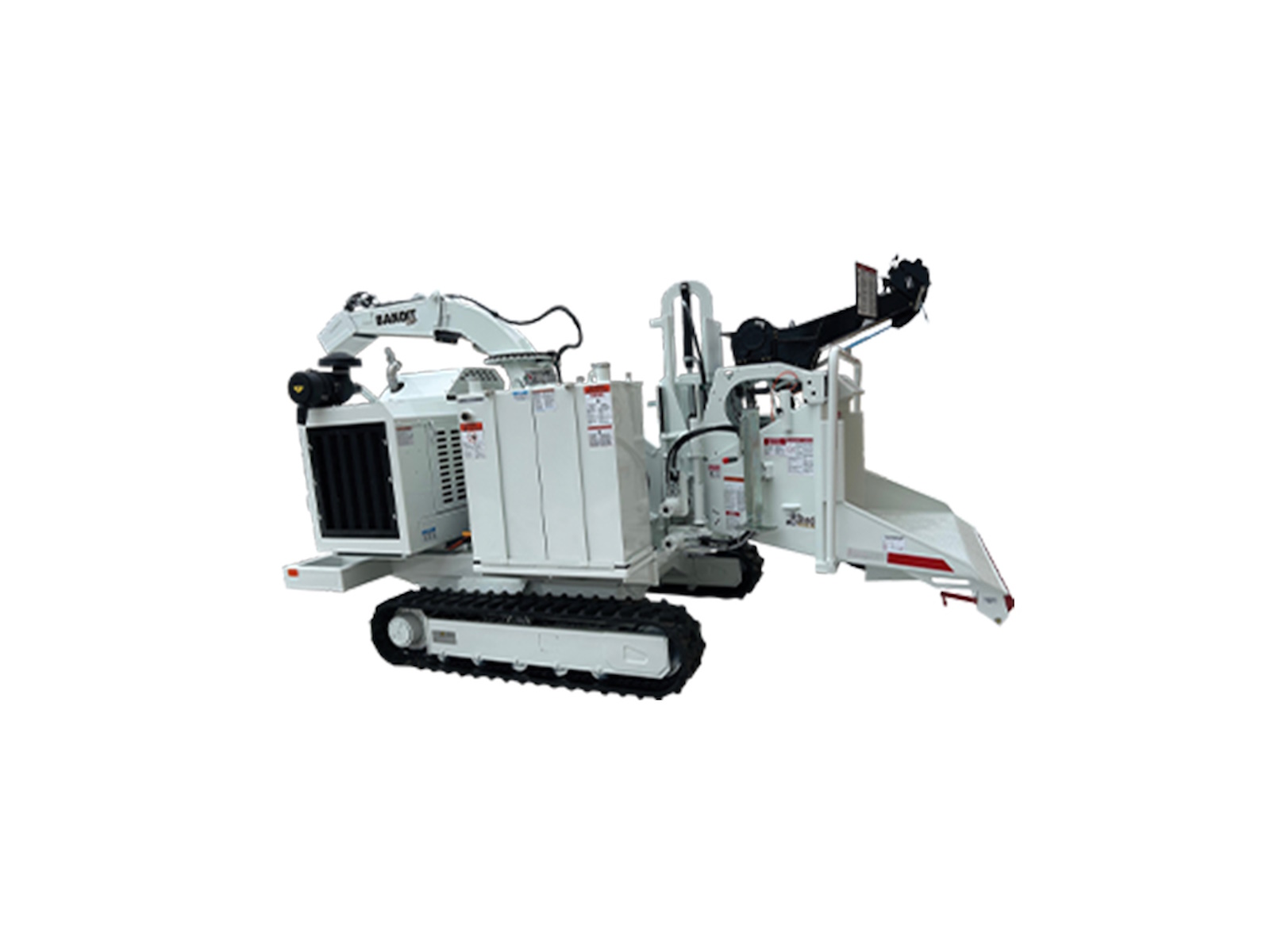 Included with a user friendly radio remote control, allowing the operator to control all track functions including the chipper feed forward / reverse, hydraulic lift cylinder up / down, discharge swivel / deflector and engine e-stop.