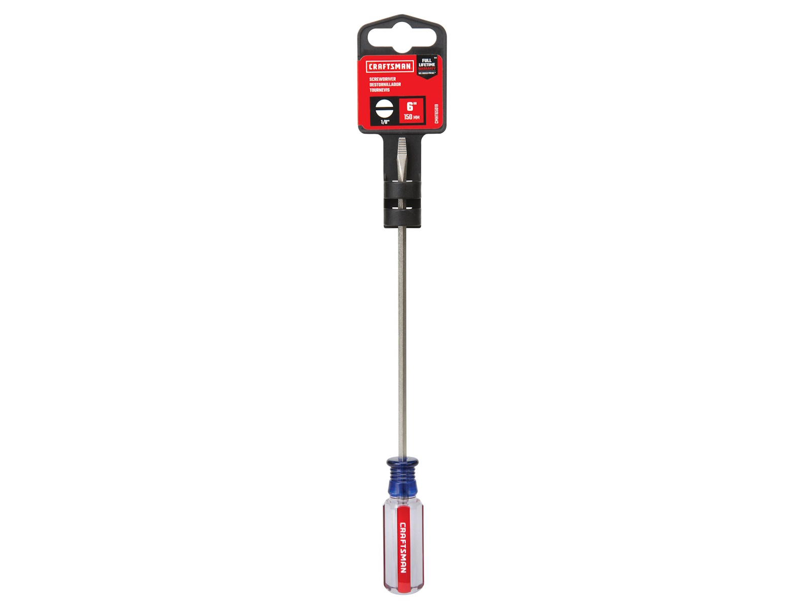 1/8-in. x 6-in. Slotted Acetate Screwdriver has an acetate handle featuring a heat-treated, alloy steel blade for increased durability. A comfort optimized handle is ideal for high and low torque applications. The Blade and shaft are coated with a satin-nickel finish to resist corrosion.