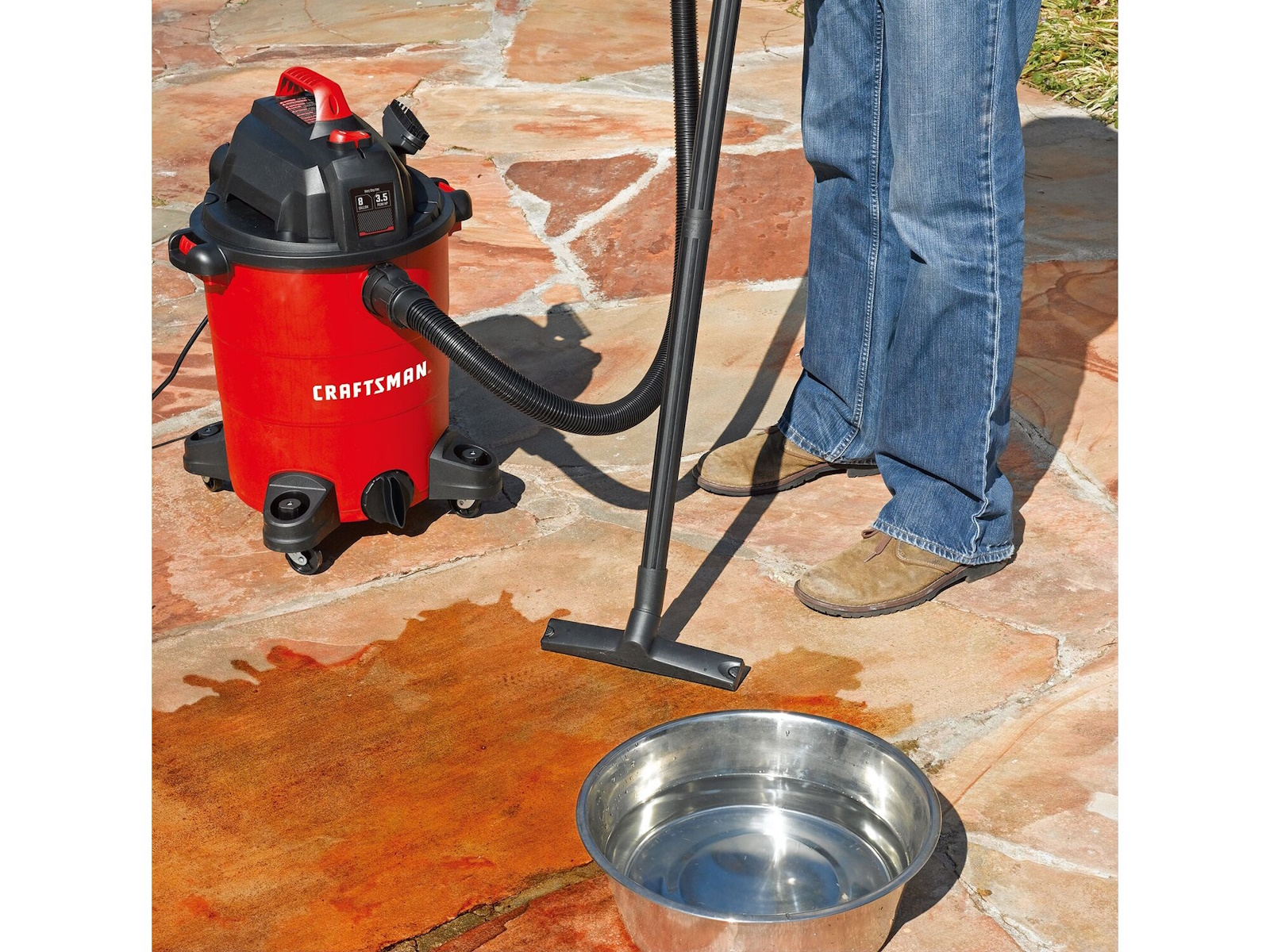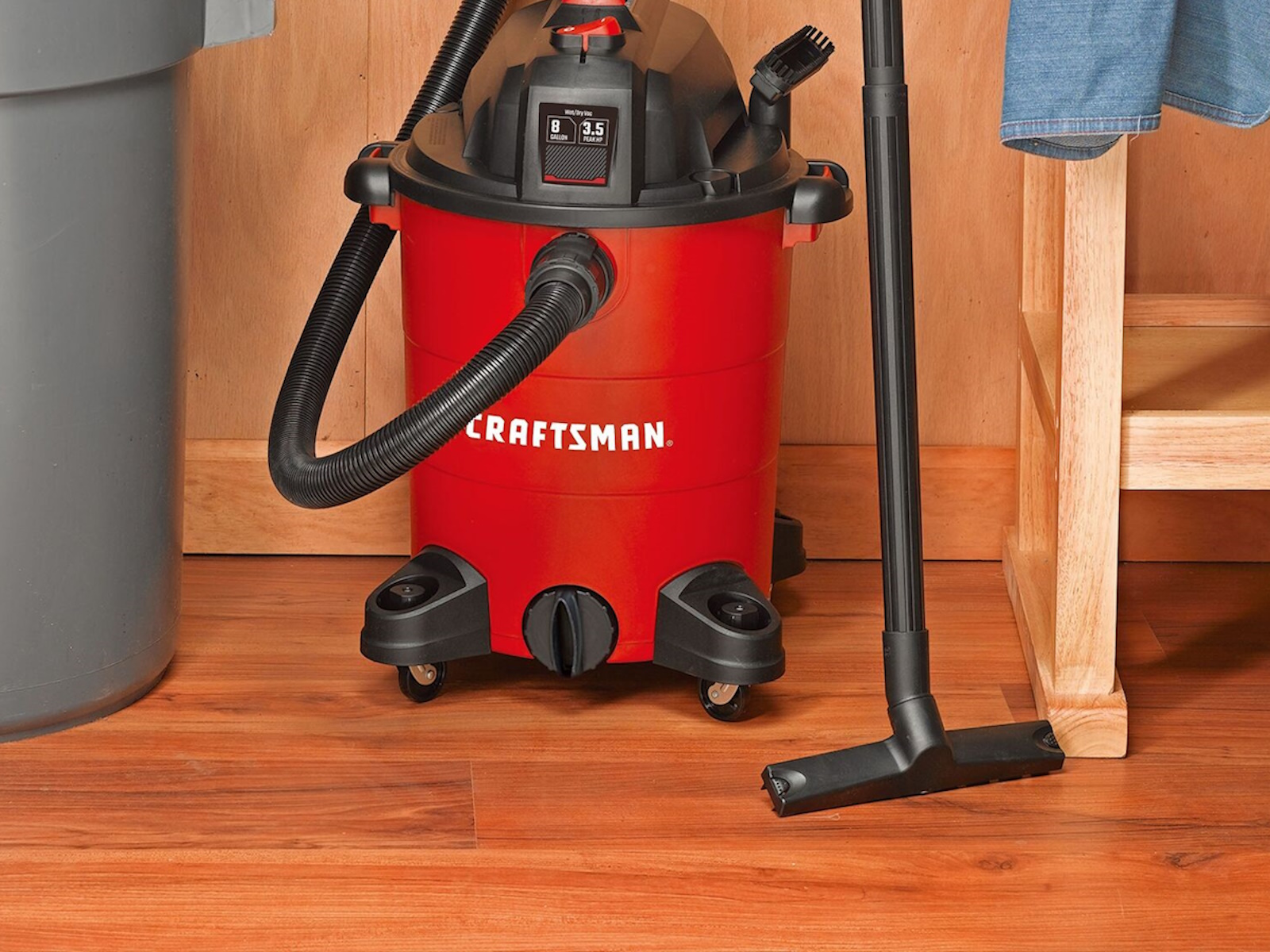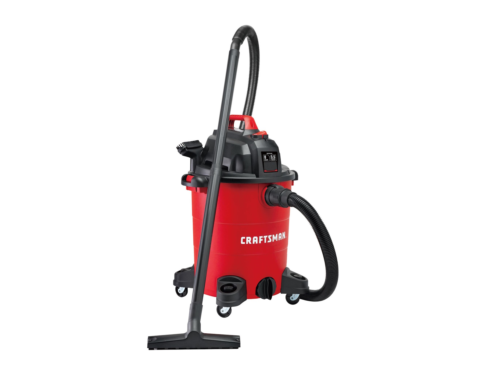 Be ready for the messiest jobs around the house, garage, or shop with the 8 gal.* Electric 3-1/2 Peak HP  Wet/Dry Vacuum. Whether its dust collection in the workshop or cleaning up liquid spills at home, the 3-1/2 Peak HP  motor makes clean-up easy. The balanced top handle design and durable, wide-stance casters provide stable transportation during and after use. In no time, convert this multi-functional vacuum into a blower to remove debris from your yard or patio.