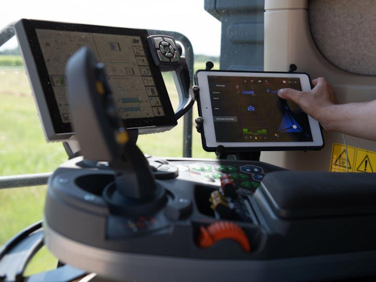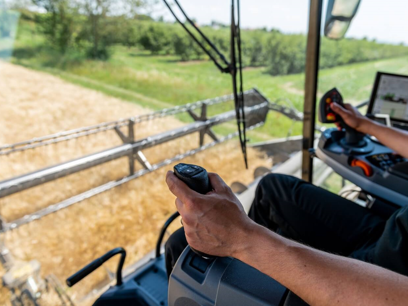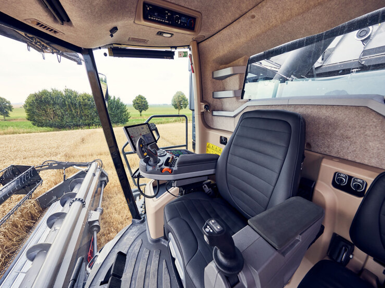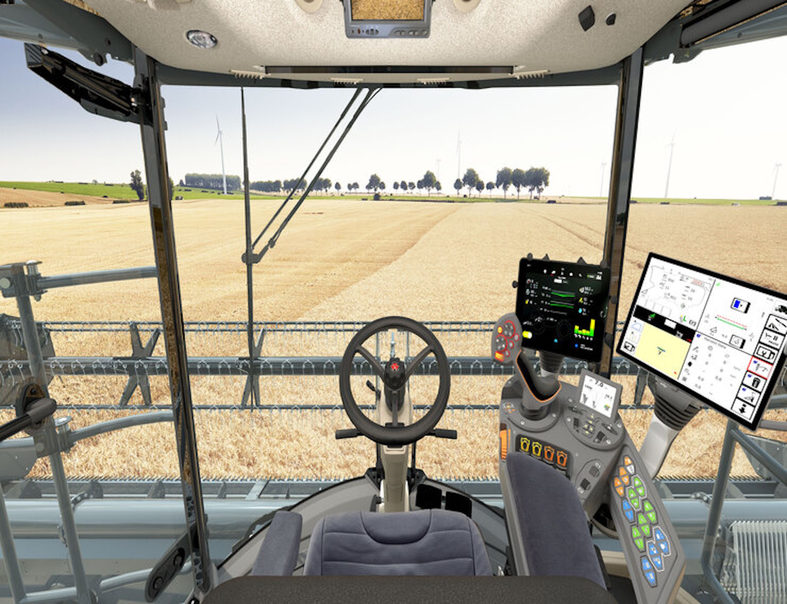 - It offers an unprecedented level of machine control and an even clearer view of the header. A joystick on the left armrest replaces the conventional steering wheel, while the PowerGrip lever on the right varies the speed and direction.