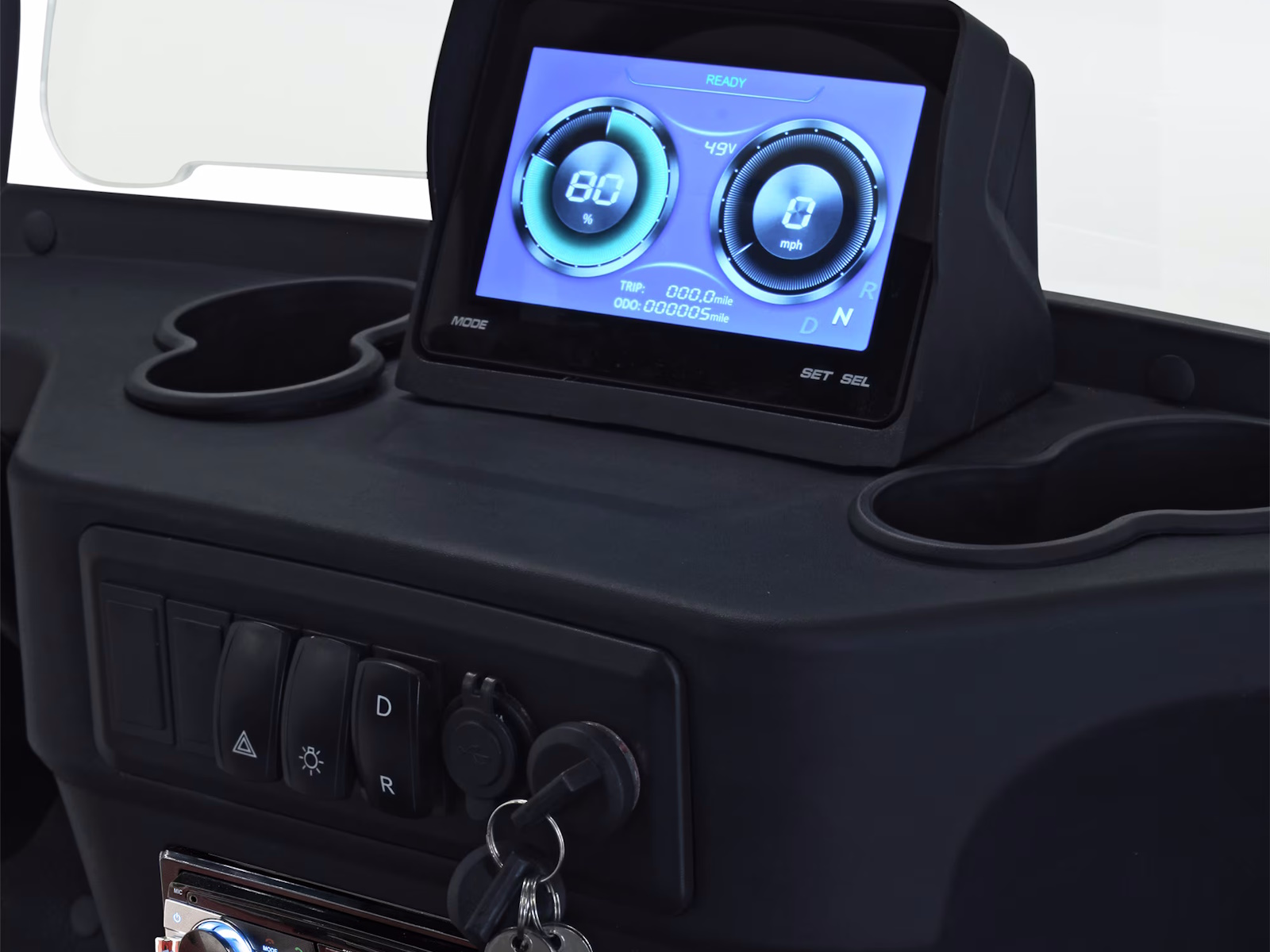 The Massimo Electric MVR 2X is a high-tech, high-performance electric golf cart that is perfect for both work and play. Featuring a powerful 48V 5kW motor, 12 inches of ground clearance, and oversized 14-inch wheels, giving it the capability to handle any terrain. Class leading standard equipment includes custom-stitched marine-grade vinyl seats, ergonomic armrests, a convertible rear-facing seat, a full-length roof, side mirrors, and a rearview camera. Powered by class-leading sealed AGM Leoch batteries, which provide a long range and less maintenance than standard flooded batteries. It also features a full LED light package for safety and visibility. With an 800-pound load capacity and up to a 45-mile range, the MVR 2X is perfect for carrying passengers, cargo, or both. It is also a great choice for use on farms, ranches, and other commercial properties.