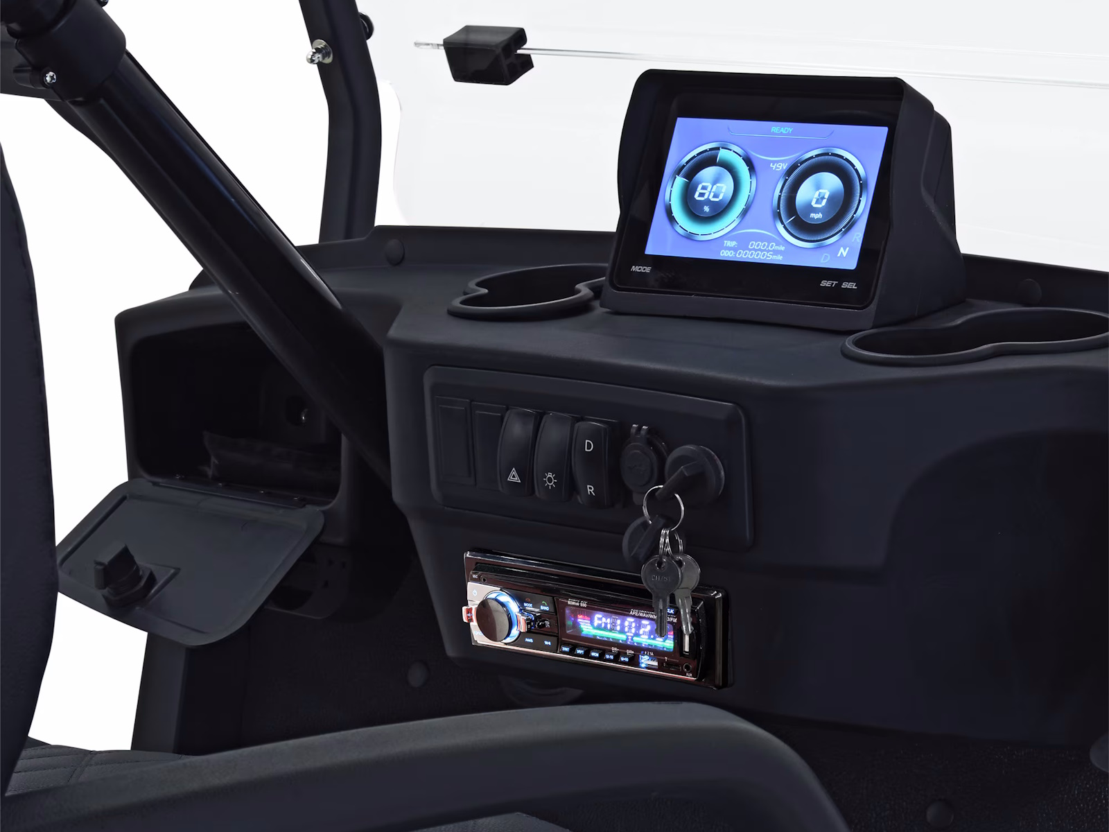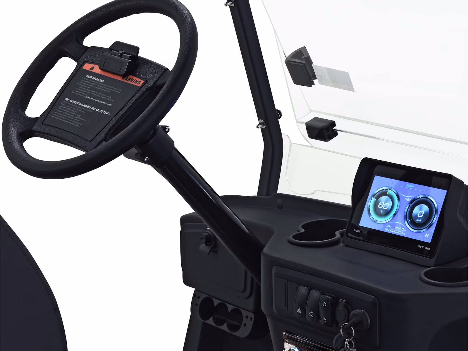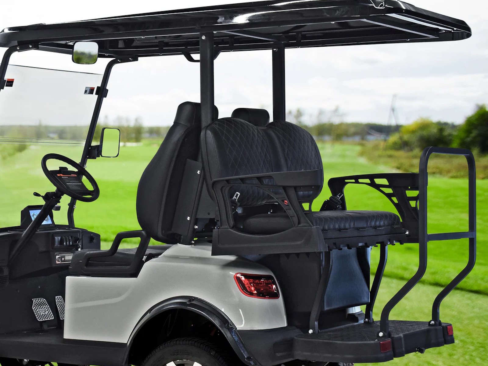 The Massimo Electric MVR 2X is a high-tech, high-performance electric golf cart that is perfect for both work and play. Featuring a powerful 48V 5kW motor, 12 inches of ground clearance, and oversized 14-inch wheels, giving it the capability to handle any terrain. Class leading standard equipment includes custom-stitched marine-grade vinyl seats, ergonomic armrests, a convertible rear-facing seat, a full-length roof, side mirrors, and a rearview camera. Powered by class-leading sealed AGM Leoch batteries, which provide a long range and less maintenance than standard flooded batteries. It also features a full LED light package for safety and visibility. With an 800-pound load capacity and up to a 45-mile range, the MVR 2X is perfect for carrying passengers, cargo, or both. It is also a great choice for use on farms, ranches, and other commercial properties.