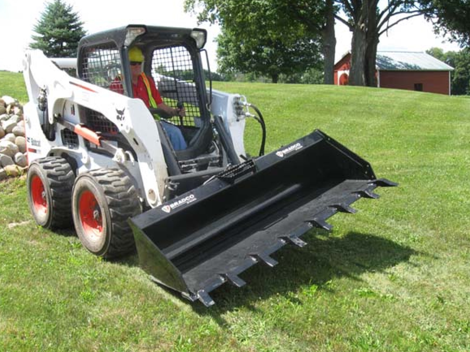 The Bradco Tilt Attach® allows full utilization of your skid steer on hilly terrain. It attaches to a skid steer universal hitch to allow 18° left of right of tilt off centerline. The Tilt Attach tilts buckets and landscaping implements for more precise grading and leveling. The Valve Package is mounted on Tilt Attach for use with hydraulically powered attachments. Simple connection by electric wiring keeps valves and hoses out of the operator's cabin. A large spherical ball bushing in the center pivot allows for extra strength and durability. This product is also available CE certified.