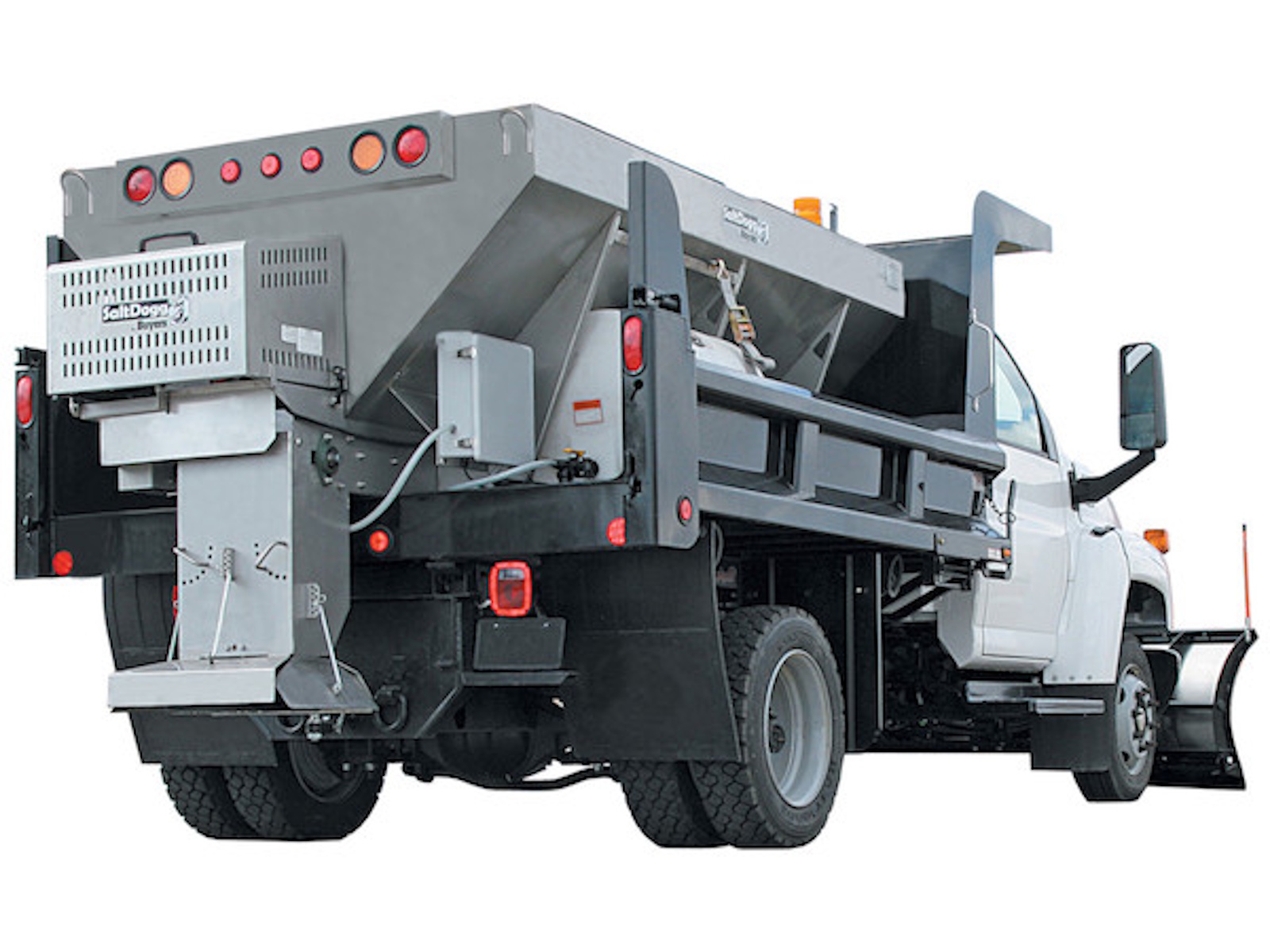 The highly corrosion-resistant welded 12GA(.105) 304 stainless steel hopper comes equipped with two top screens with 1/4 in bars. The 14-1/2 in. wide, high-flow, steel pintle chain conveyor has 1/4 in. crossbars and a stainless steel floor. The high-torque conveyor gearbox has a 20:1 ratio with a 1 in. input shaft and 1-1/8 in. output shaft on tapered roller bearings to provide extra power on startup. A SaltDogg Spreader is built to last. A stainless steel inverted V reduces stress on the drive line to improve material flow. An adjustable feedgate with lock pin offers additional material flow control.